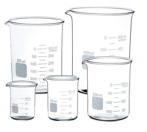 Low form glass beakers are about one and half times taller than they are wide. They feature a spout for pouring their contents and straight sides and will withstand typical laboratory thermal variations common to chemistry processes like heating and cooling.