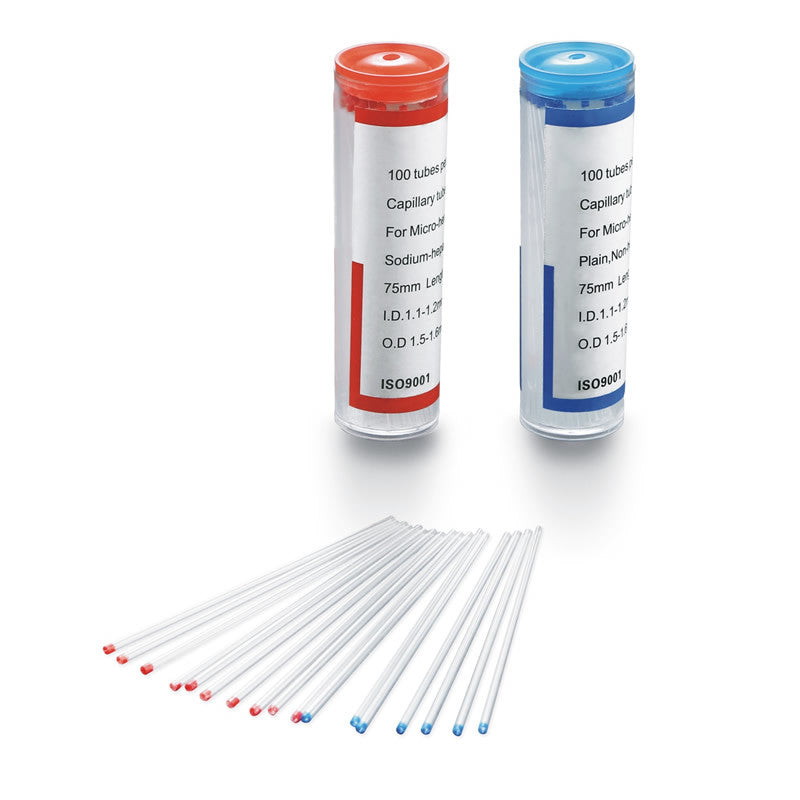 Heparinized tubes are red coded, and non-heparinized are blue coded. Micro-hematocrit tubes are used to measure the volume percentage of red blood cells in blood. Heparinized tubes are red coded, and non-heparinized are blue coded.