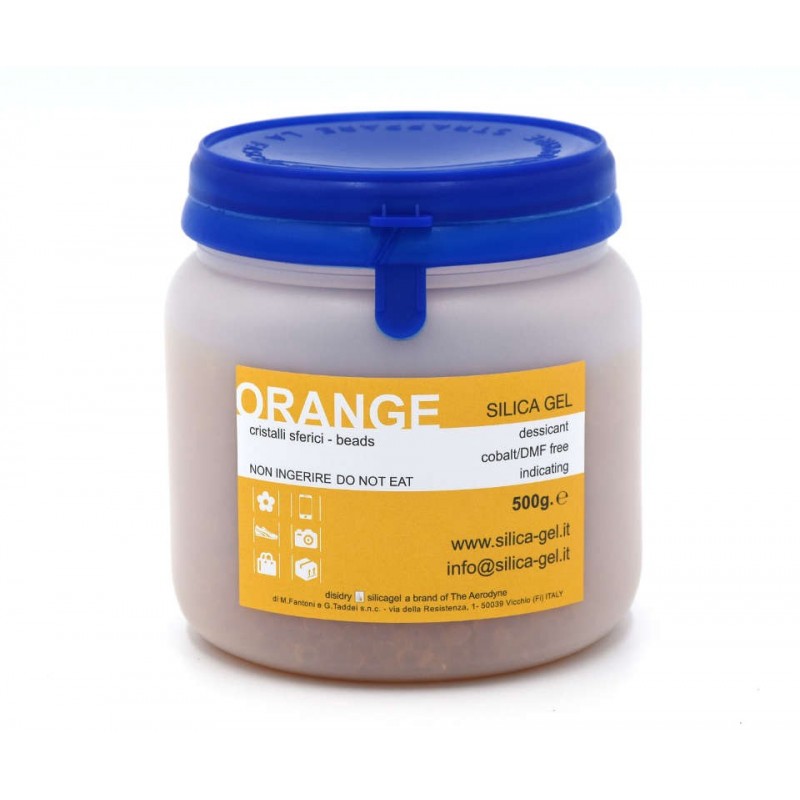 Silica gel orange self indicator (500g) is a type of desiccant with humidity indicating function. After absorbing moisture, it changes color, visually indicating the relative humidity of the given environments. It is widely used as: