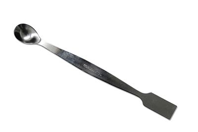 The double-sided multi-purpose spoon is a spoon on one side and a spatula on the other. Manufactured from a single piece of stainless steel, the spoon-spatula has no edges, crevices or undercuts. Uses: